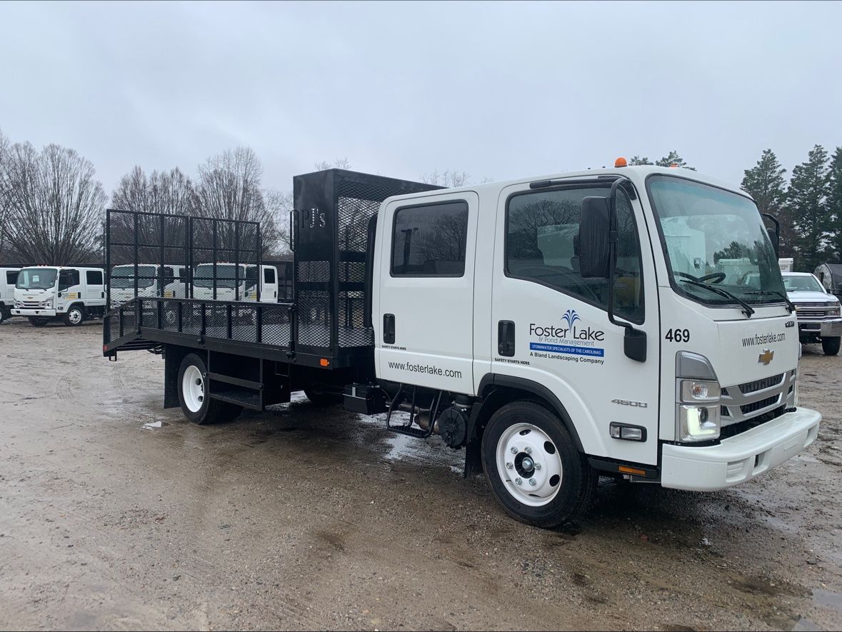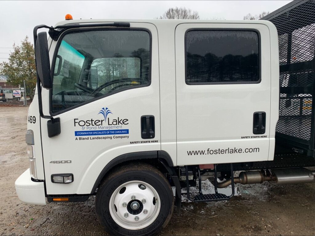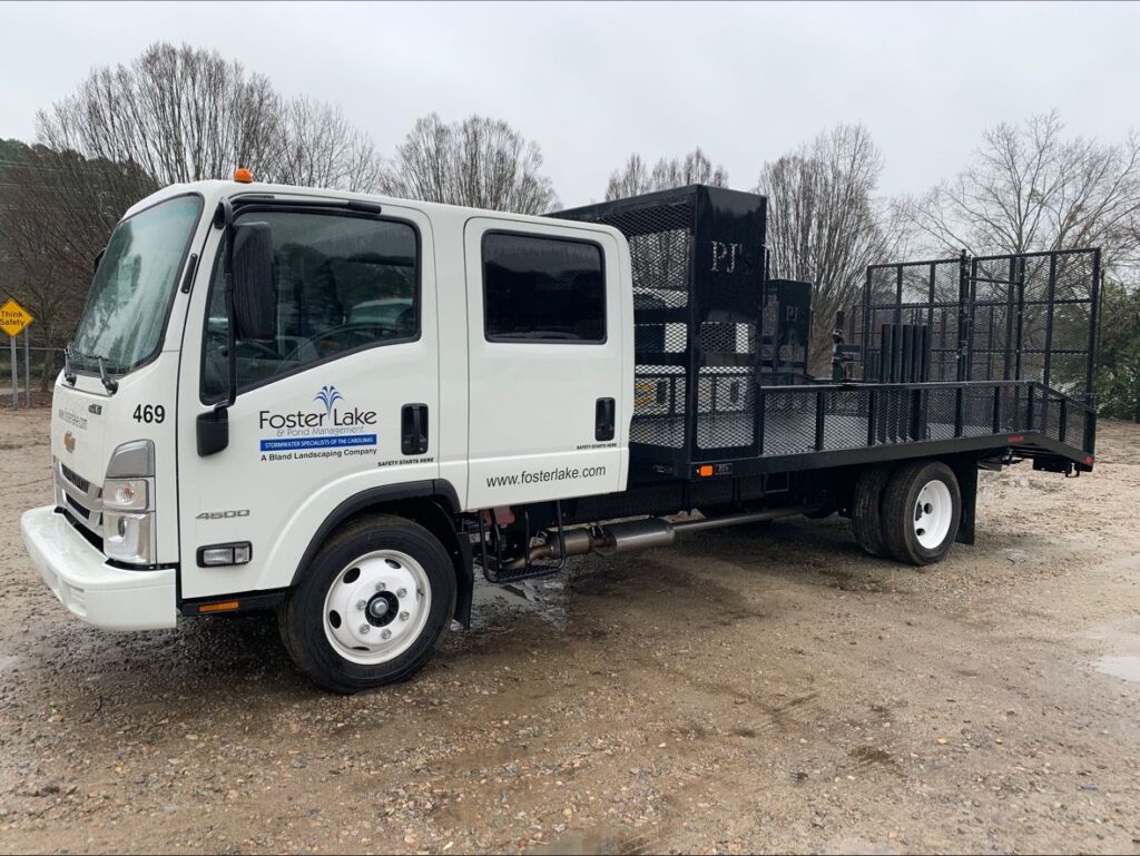 Be on the lookout for the first of our dedicated Foster Lake & Pond Management, Inc. SCM Mowing Crew rigs that will be hitting the road any day now. This newly outfitted rig is the result of the Bland Landscaping Company Operations Team’s experience in mowing being paired with the Foster Lake & Pond Management, Inc. Operations Team’s experience in Stormwater Control Measure Maintenance and Repair. This new configuration will allow for safe transport of specialty equipment, commercial mowers, stick equipment, and necessary hand tools for a safe and productive crew. The quad cab LCF platform is capable of moving a highly productive team of operators and technicians without the encumbrance of a trailer for those hard to navigate neighborhood streets that lead to many of the stormwater devices we manage.