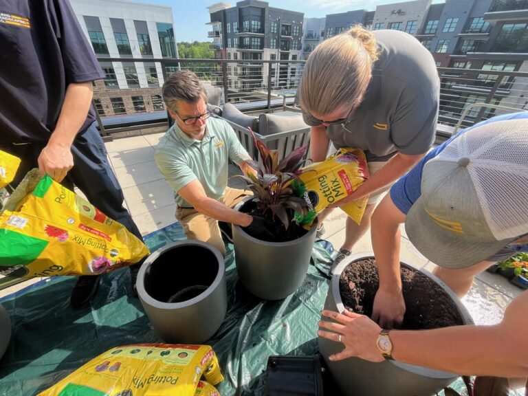 Yesterday morning was well spent with our friends at Cushman & Wakefield, as our teams came together to plant 8 pots on the terrace of their new Fenton office. The visual impact of adding live plant material to an already amazing space just elevated this terrace to a new level.